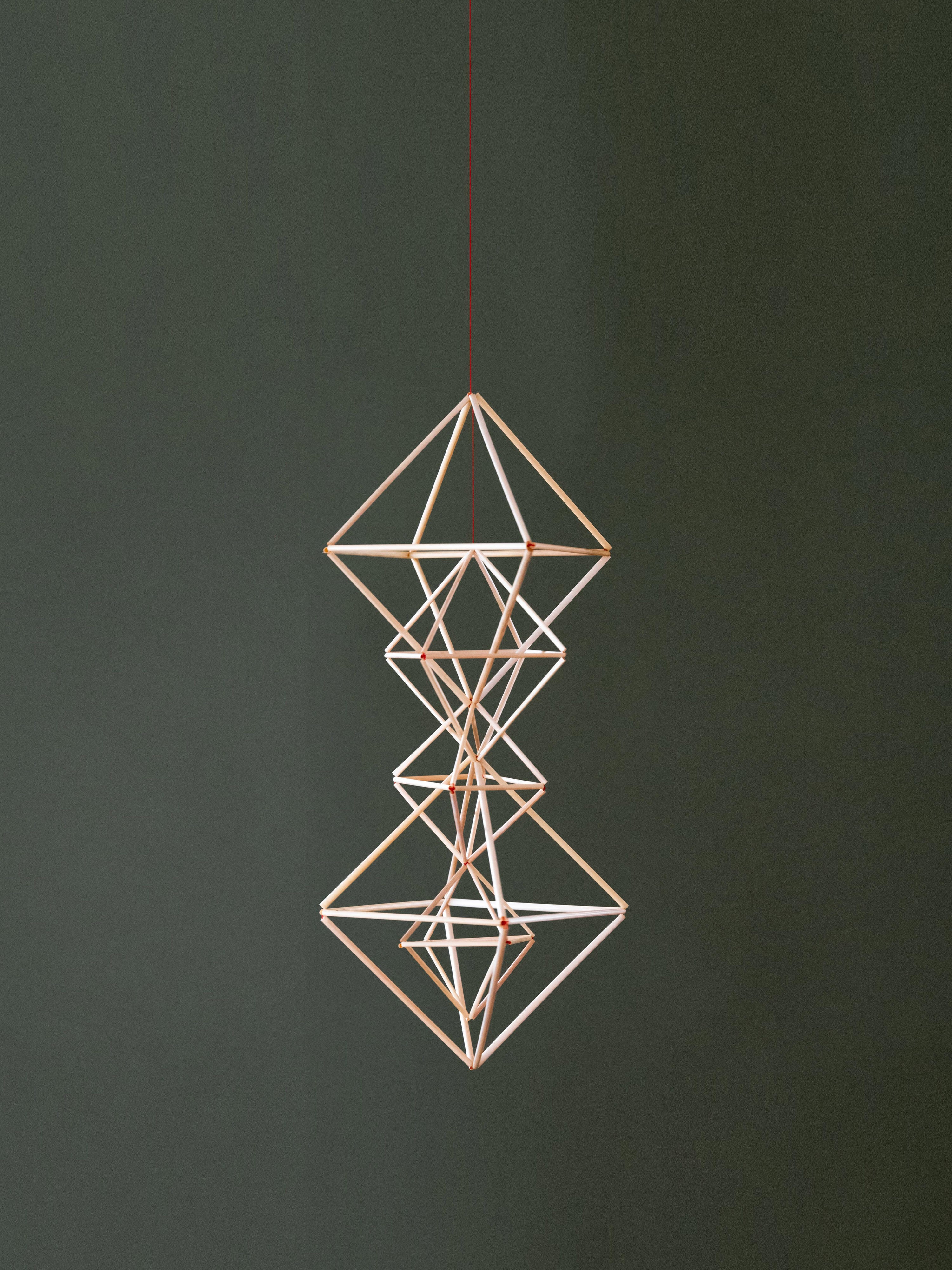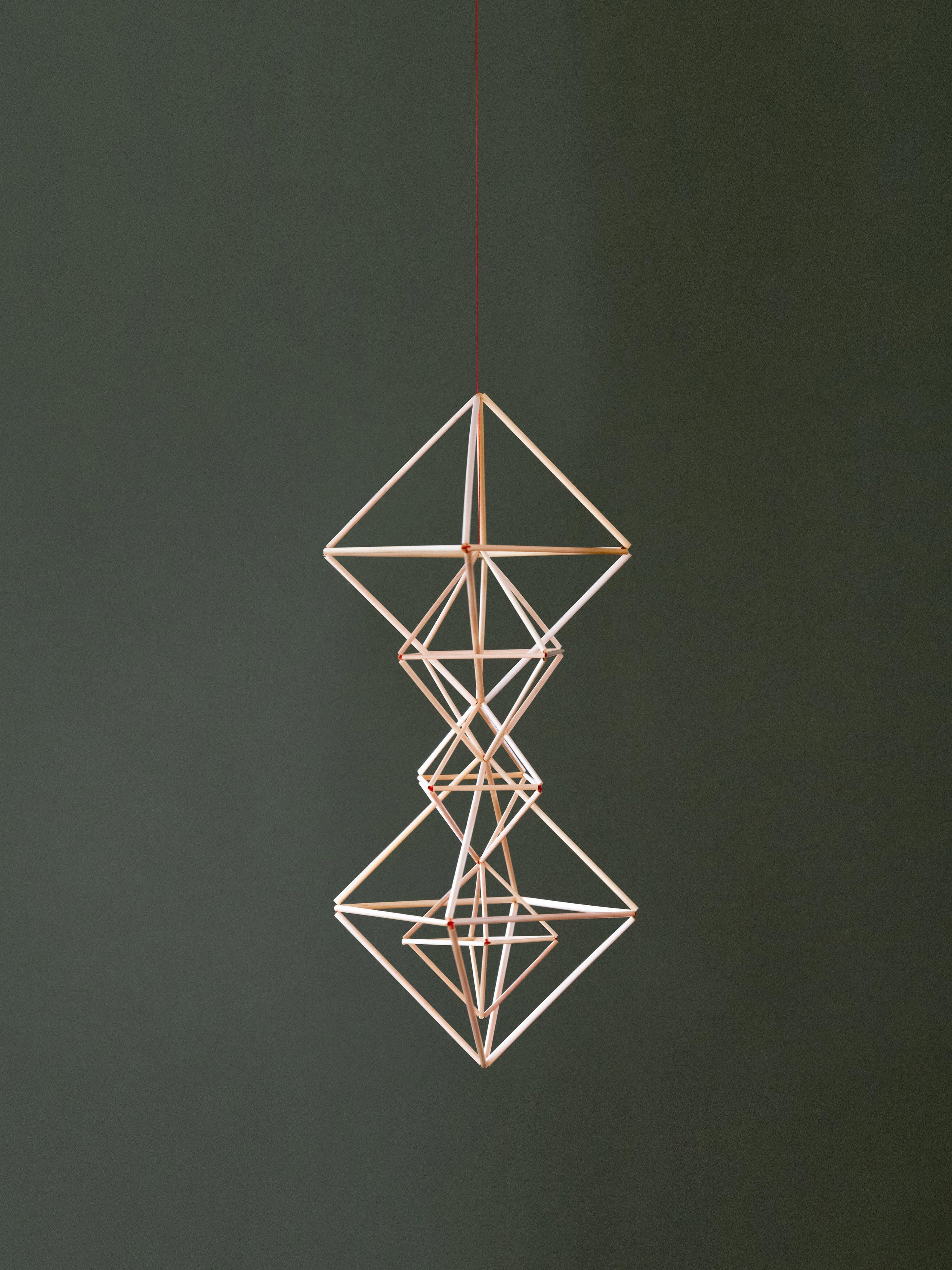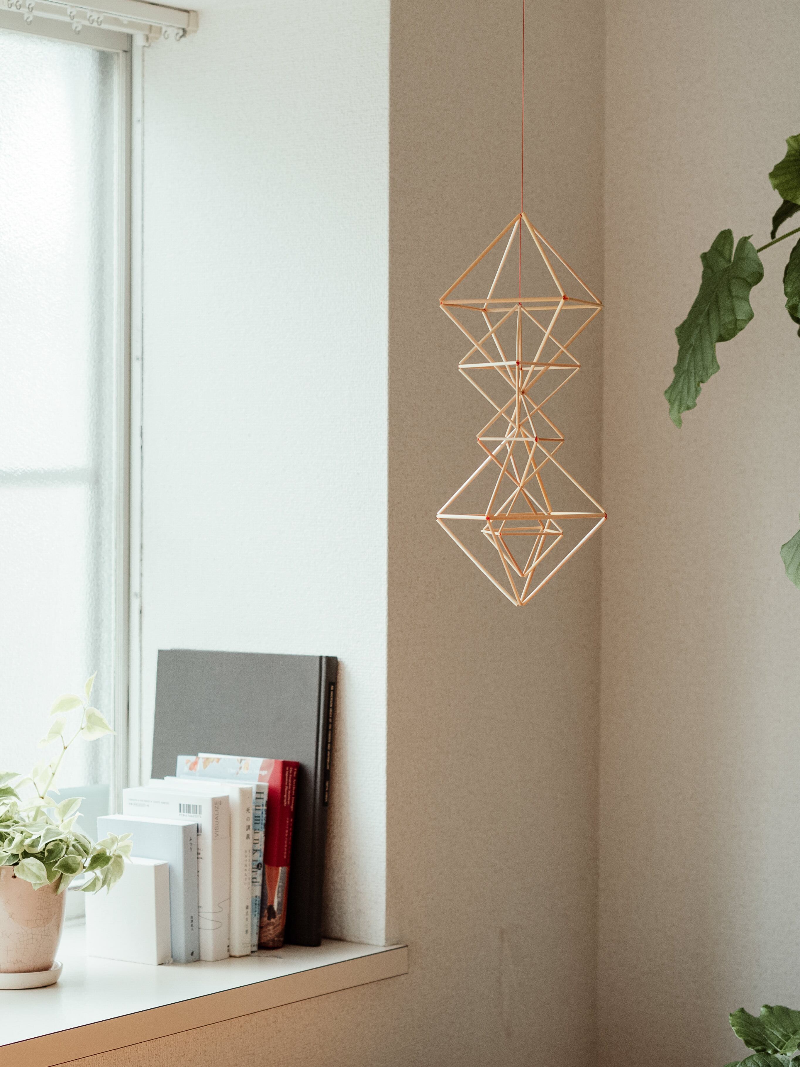 シンプルな四角の正八面体を繋げた作品です。3種類の大きさになっており、光が透るさまを表現しています。日常生活の中で目には見えないですが、私たちは多くの光や感情、情報をつねに浴びていると思います。