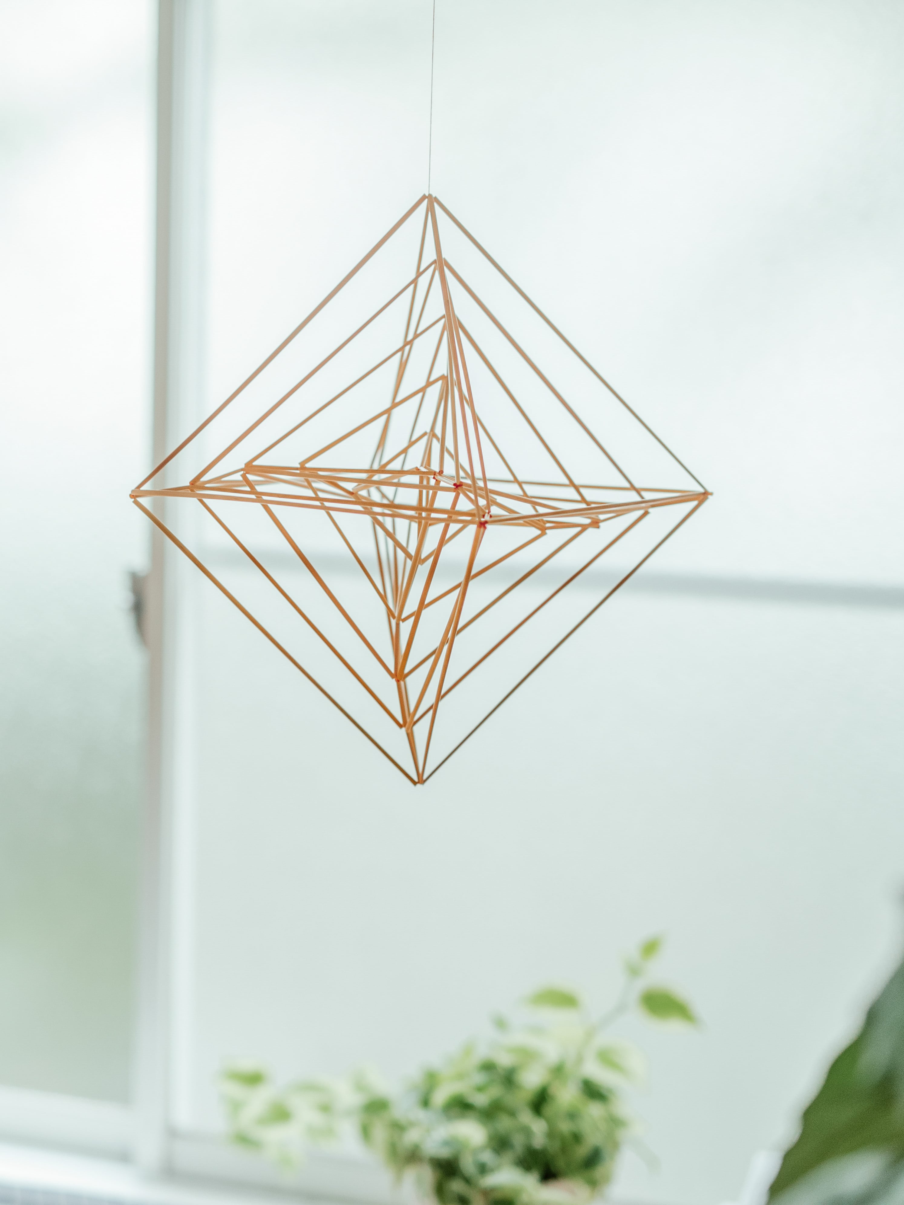 バタフライエフェクトをイメージした作品です。蝶々の羽の小さな一振りはわずかな小さな変化を起こし、そのわずかな変化がいずれは大きな変化になります。ヒンメリで四角である正八面体の形をあえて少しずつ回転するように制作し、変化していくさまを表現しています。3点の作品が変化のさまを力強く魅せてくれます。